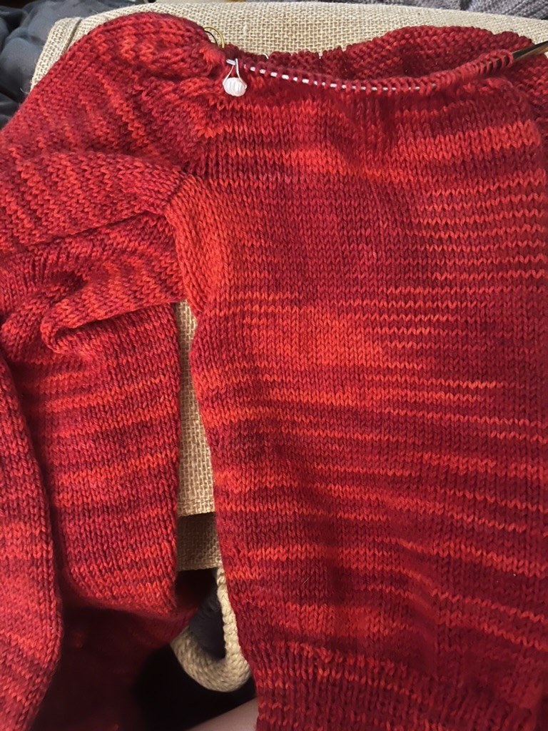 Here we are, some measure into the rest. With three balls wound, I used one to do the body, and one for each sleeve. Then when I connected the body, I went back to the one I’d been using there. It ran out right about the time of this picture, so I attached one of the sleeve balls and continued on. That second ball was enough to finish the sweater, so I used a total of 2.5 balls, meaning the whole sweater cost under $50, including enough extra yarn to make a pair of short socks or a hat or something.
