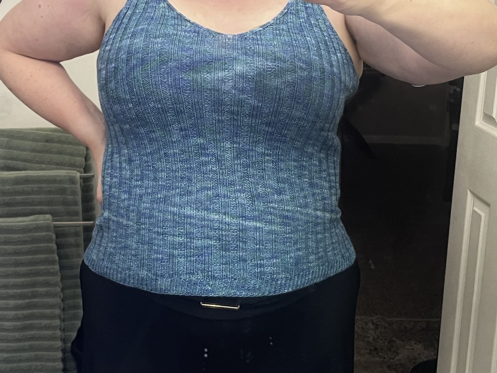 The initial bralette was a single skein of green yarn, and it made a nice layering piece for the dead of frozen winter in Iowa, but it also got me thinking: wouldn’t this make a great tank top, if I just made it long?