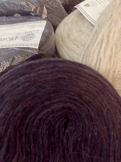 My yarn, in my chosen colors. The purple really doesn’t photograph well, but it’s a beautiful plum shade.