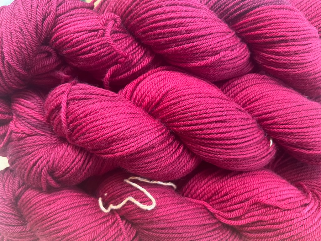 I used pretty much every shade of red dye I have in combination to give the color more depth, and then my particular dyeing style is soaking the yarn in plain water first, then adding it to the dyepot with the color in it, and then when the color is about half taken up, I add the acid to set it, so it still has sections of tonality, and doesn’t come out one uniform shade.