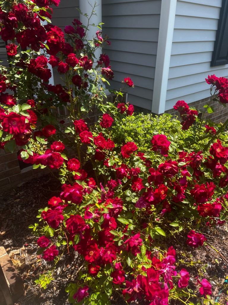 So this is right near my front door. It was planted . . . last year, before they put the house up for sale, and when I first saw it, it was just a wee tiny rose bush, not even hip high.