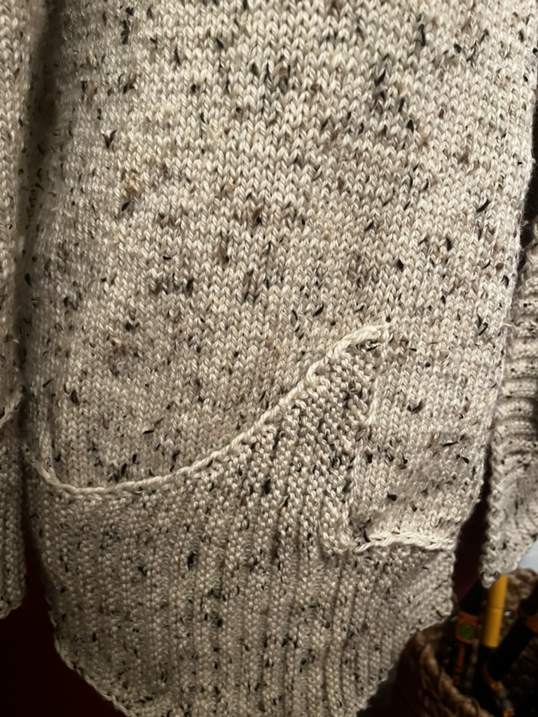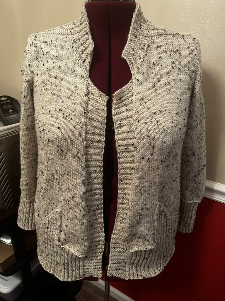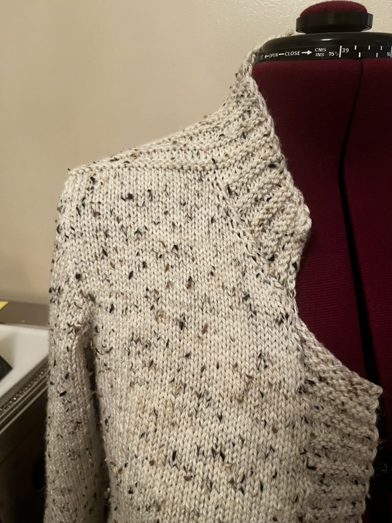 It’s a little tight, but that’s probably back to my slightly-small gauge rather than the pattern. It’s also not too tight, I’m mostly worried about the buttons pulling a little when I finish and put it on. Maybe in another five pounds or so.