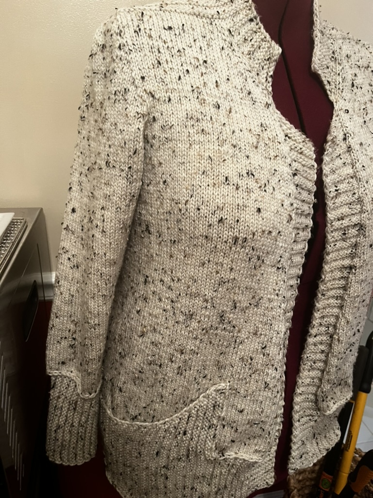 And so far, the cardigan had taken me four days: two for the main body, and two for these little sleeve nubbins. The remainder of the sleeves took me another day and a half of steady knitting, and then I connected them to the body.
